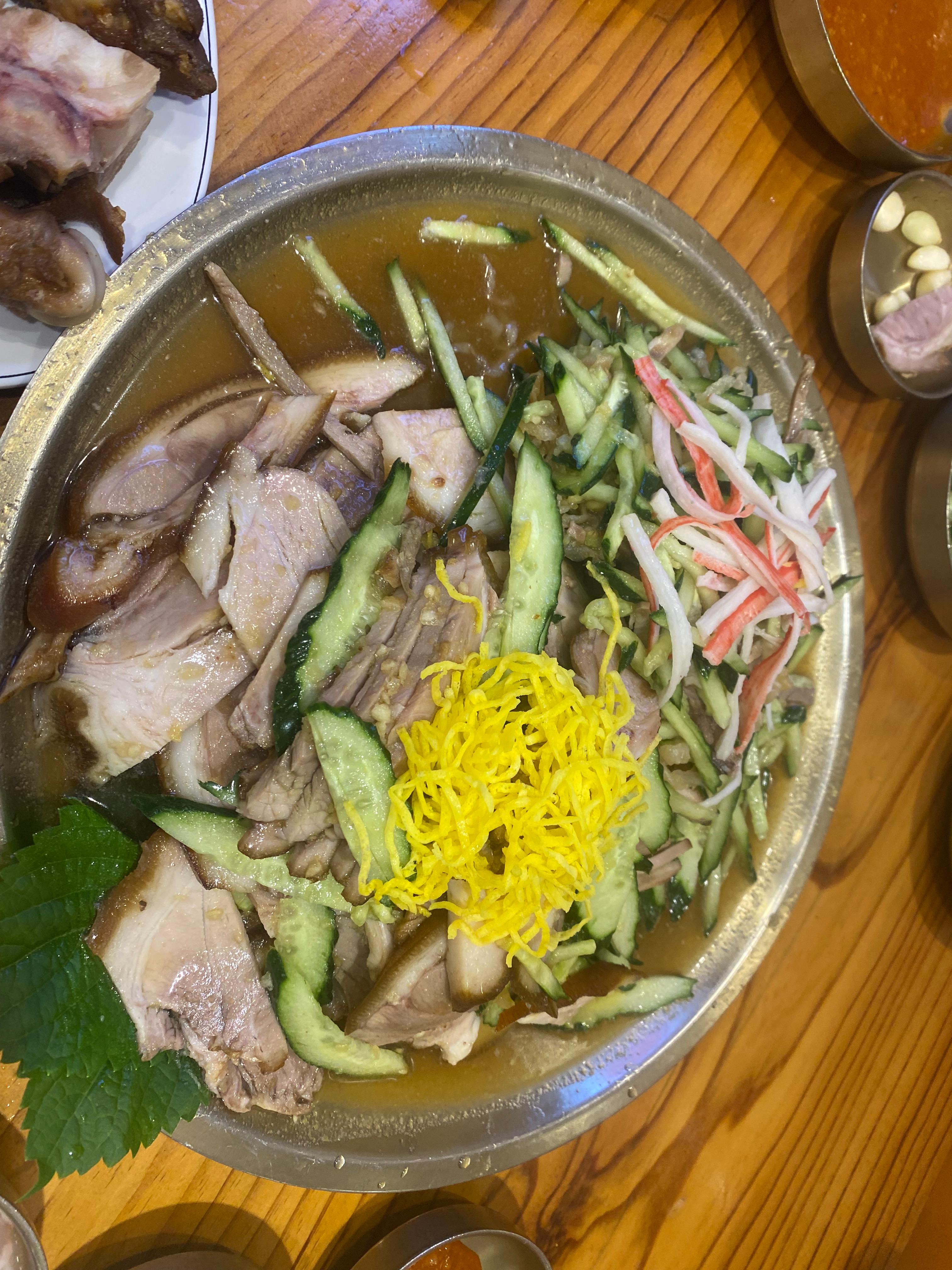 겨자소스는 자극적이지 않게 알싸한 정도만 살렸고, 얇게 채썬 무, 당근, 오이와 잘 섞이면 샐러드를 먹는 듯 가볍고 상큼한 맛이 납니다. 첫 입부터 입맛을 확 깨워주며, 특히 더운 날에는 이보다 더 시원하고 만족스러운 고기 요리가 없을 정도입니다.